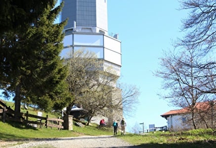 Wanderer auf dem Gipfelplateau des Großen Feldbergs (881 m). Nach steilen Anstiegen genießt man vom unbewaldeten Gipfelplateau des Großen Feldbergs einen herrlichen Blick auf das Usinger Land und die Mainebene.
