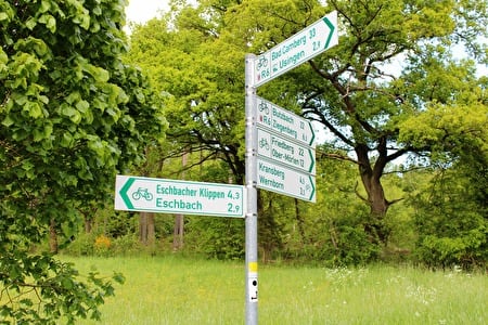 Radwegbeschilderung im Usinger Land bei Usingen. Das Usinger Land ist durchzogen von einem Netz gut ausgebauter Radwege. Neben regionalen Routen bieten zwei der hessischen Radfernwege (R6 und R8) die Möglichkeit, die reizvolle Landschaft nördlich des Großen Feldbergs per Rad zu entdecken. E-Bikes bieten in dem sanft hügeligen Terrain eine Alternative zu herkömmlichen Rädern.