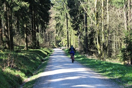 Radfahrer auf dem Deutschen Limes-Radweg. Wer sich nicht nur für das römische Erbe im Taunus interessiert, sondern gleichzeitig eine sportliche Herausforderung sucht, ist auf dem zweiten Abschnitt des Deutschen Limes-Radweg bestens aufgehoben. Auf rund 100 Kilometern geht es in stetigem Auf und Ab vorbei an beeindruckenden Resten der römischen Baukunst.