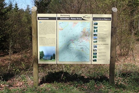 Wegweiser in der Nähe des Roten Kreuzes (688 m), dem Start des Weiltalweges. Mit einer Gesamtlänge von 47,5 km erstreckt sich der Weiltalweg vom Hochtaunus bis zur Residenzstadt Weilburg. Auf dem Weg in Richtung Norden geht es entlang der romantischen Weil meist sanft bergab. Für Wanderer und Radfahrer ist der Weiltalweg gleichermaßen geeignet. Gut ausgebaut und mit vielen Rastmöglichkeiten versehen, führt der Weg vorbei an Naturdenkmälern und Sehenswürdigkeiten aller Art. Hinzu kommen tolle Ausblicke und gemütliche Einkehrmöglichkeiten.