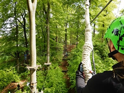 Besucherin im Kletterwald Taunus. Im Taunus gibt an verschiedenen Orten attraktive Möglichkeiten zum Klettern. Der Klettergarten in Friedrichsdorf ist ein Waldseilpark der Superlative. Dort wartet nicht nur der höchste Parcours Deutschlands Bezwinger, sondern auch die zwei längsten Seilrutschen Hessens. Spaß, Nervenkitzel und ein außergewöhnliches Naturerlebnis sind garantiert.