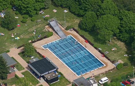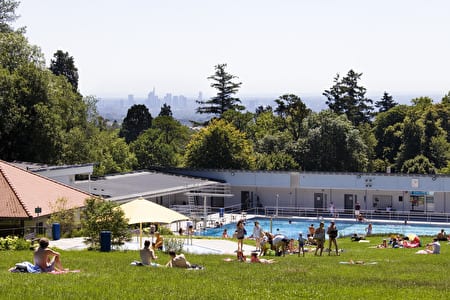 Badegäste im Waldschwimmbad Kronberg. Das beliebte Bad bietet seinen Gästen eine Quellwasserversorgung aus dem Bürgelstollen, eine 50-Meter-Rutsche sowie Bodensprudler, Strömungskanal, Wasserkanone und Rückenduschen. Das Highlight ist jedoch der Blick von der Liegewiese auf die imposante Skyline von Frankfurt am Main.