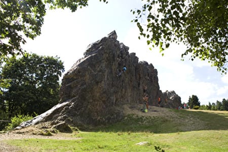 Kletterer an den Eschbacher Klippen unweit Usingen-Eschbach. Die Eschbacher Klippen sind ein sichtbarer Teil eines etwa sechs Kilometer langen Quarzganges, der sich quer durch das Usatal bis zum Wormstein im Usinger Stadtwald fortsetzt. Die bizarr anmutende Felswand ist perfekt geeignet für Kletteranfänger oder zum Bouldern.