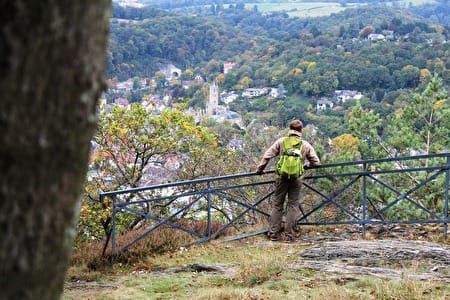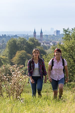 Wanderer oberhalb von Eppstein am Schinderhannespfad. Der Schinderhannespfad ist rund 180 km lang und verläuft über sieben Etappen einmal quer durch den Taunus. Ein Teil des Weges, der Taunus Schinderhannes Steig, ist vom Deutschen Wanderverband als "Qualitätswanderweg" ausgezeichnet worden.