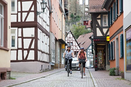 Radfahrer in der Eppsteiner Altstadt, im Hintergrund Burg Eppstein. Das imposante Bauwerk aus dem 14. Jahrhundert beherrscht die charmante kleine Altstadt, die von malerischen Fachwerkhäusern gesäumt wird.