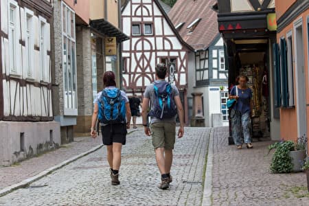 Wanderer in der Eppsteiner Altstadt. Durch Eppstein verläuft der Taunus Schinderhannes Steig, ein rund 38 Kilometer langer Wanderweg, der vom Deutschen Wanderverband als Qualitätsweg klassifiziert wurde. Weitere Highlights für Wanderer sind der Panoramaweg und der Richard-Hofmann-Weg, die auf rund um Eppstein führen.