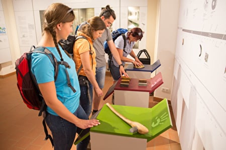 Besucher in einem Ausstellungsraum der Saalburg. Inszenierte Räume, Modelle und archäologische Funde machen die Wohn- und Arbeitswelt der Soldaten und der Bevölkerung im Dorf vor den Toren der Saalburg anschaulich. Ein Rundgang durch die Saalburg gibt den Besuchern einen guten Einblick in die Geschichte, Kultur und Lebensart der Römer.