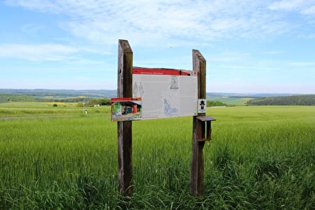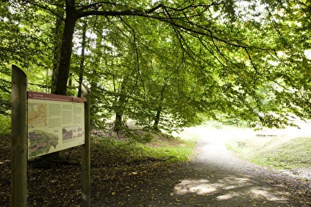 Schautafel bei Hohenstein im Untertaunus. Der rund fünf Kilometer lange Limesrundweg Georgenthal führt an sichtbaren Resten der römischen Grenzbefestigung (Graben und Wall) sowie an drei Wachttürmen vorbei. Entlang des Weges befinden sich neun Tafeln mit Informationen über den Limes. Ein Palisaden-Nachbau vermittelt den gewaltigen Aufwand, den die Römer zu der Grenzbefestigung erbrachten.