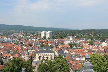 Blick vom Weißen Turm, dem Wahrzeichen Bad Homburgs, in Richtung des Taunushauptkamms. Bad Homburg ist mit rund 53.000 Einwohnern die größte Stadt im Taunus. Die Stadt begeistert mit Bäderarchitektur der Jahrhundertwende, dem denkmalgeschützte Kurpark sowie dem Landgrafenschloss und einer romantischen Altstadt. Die berühmte Bad Homburger Spielbank gilt als Mutter von Monte Carlo.