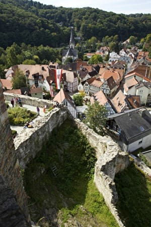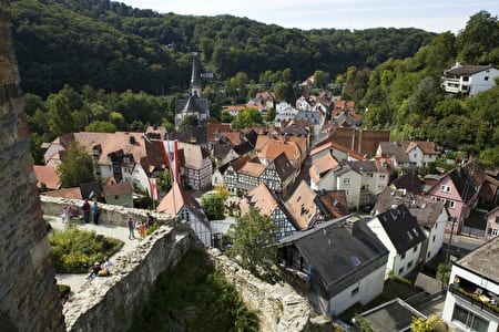 Blick vom Bergfried von Burg Eppstein auf die historische Alstadt von Eppstein. Malerische Fachwerkhäuser, lauschige Plätzchen und stille Winkel umgeben die Stadtkrone, die aus dem 14. Jahrhundert stammende Burg der Herren von Eppstein. Unweit der Burg befindet sich die Talkirche, das älteste erhaltene Bauwerk Eppsteins.