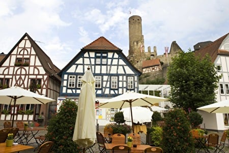 Blick vom Wernerplatz über die Burgstraße auf den Bergfried von Burg Eppstein. Malerische Fachwerkhäuser, lauschige Plätzchen und stille Winkel umgeben die Stadtkrone, die aus dem 14. Jahrhundert stammende Burg der Herren von Eppstein. Unweit der Burg befindet sich die Talkirche, das älteste erhaltene Bauwerk Eppsteins.