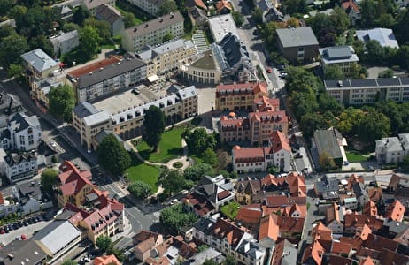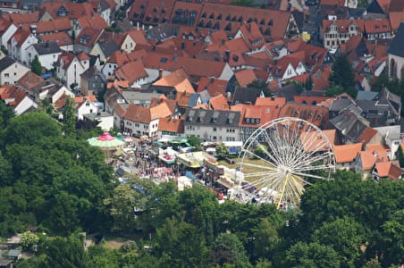 Der Oberurseler Marktplatz während des Brunnenfestes aus der Vogelperspektive. Oberursels Alstadt erfreut Besucher mit vielen sorgsam restaurierten Fachwerkhäusern und engen Gässchen , zahlreichen Brunnen, dem historischen Markplatz mit dem Vortaunusmuseum sowie der aus dem 15. Jahrhundert stammenden St-Ursula-Kirche. Im Frühjahr jeden Jahres findet das beliebte Brunnenfest statt.