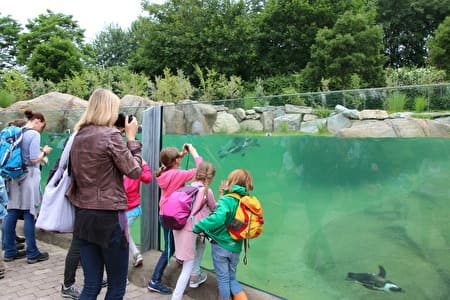 Brillenpinguine auf der 2016 fertiggestellten Anlage. Die 15 auf der Anlage lebenden Tiere gehören seit ihrer Ankunft zu den beliebtesten Bewohnern des Zoos. Ursprünglich bevölkern Brillenpinguine die Küsten Südafrikas und Namibias. Die als bedroht geltenden Tiere werden bis zu 70 Zentimeter groß und wiegen bis zu vier Kilogramm.