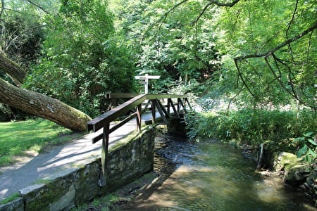 Brücke über die Weil und Weiltalweg bei Altweilnau. Das Flüsschen Weil entspringt in der Gemarkung von Glashütten auf einer Höhe von rund 740 Meter über NN. Nach kurzem Lauf durch die quellnahen Reifenberger Wiesen fließt es durch das idyllische Weiltal, unter anderem durch Alt- und Neuweilnau, Rod an der Weil und Weilmünster. Parallel zur Weil verläuft der rund 50 km lange Weiltalweg, einer der schönsten Rad- bzw. Wanderwege im Taunus.