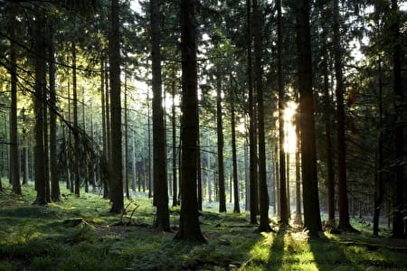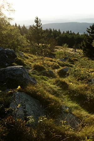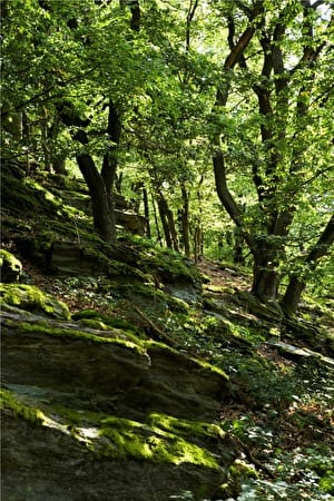 Natur in der Nähe des Großen Feldbergs (881 m). Dichte Wälder, Felsen und steile Hänge prägen den Taunushauptkamm und sorgen für Naturerlebnisse, z. B. bei einer Wanderung auf dem Limeserlebnispfad.