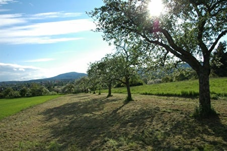 Streuobstwiese im Vordertaunus mit dem Hohen Taunus im Hintergund. Streuobstwiesen sind ein sichtbarer Bestandteil der Kulturlandschaft im Taunus. Sie sind ökologisch wertvolle Lebensräume und spiegeln die wirtschaftlichen und sozialen Bedürfnisse vergangenen Zeiten wieder. Nicht nur Steinkauz, Grünspecht und zahlreiche Insekten, sondern auch Spaziergänger, Wanderer und Radfahrer erfreuen sich an den Wiesen.