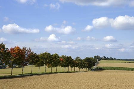 Hochtaunusstraße, Goldener Grund bei Bad Camberg mit Blick auf die Kreuzkapelle. 55 Kilometer Kurven und Kultur - das ist die Hochtaunusstraße. Die Ferienstraße gehört mit ihrem abwechslungsreichen Verlauf und einer Vielzahl von Natur- und Kulturdenkmälern zu den reizvollsten ihrer Art.