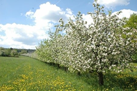 Streuobtswiese nahe Usingen. Streuobstwiesen sind ein sichtbarer Bestandteil der Kulturlandschaft im Taunus. Sie sind ökologisch wertvolle Lebensräume und spiegeln die wirtschaftlichen und sozialen Bedürfnisse vergangenen Zeiten wieder. Nicht nur Steinkauz, Grünspecht und zahlreiche Insekten, sondern auch Spaziergänger, Wanderer und Radfahrer erfreuen sich an den Wiesen.