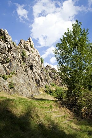 Klippen in Usingen-Eschbach. Die Eschbacher Klippen bilden zu der sanfthügeligen Landschaft des Naturpark Hochtaunus einen starken Kontrast. Die Felswand ist sichtbarer Teil eines etwa 6 km langen Quarzganges, der sich quer durch das Usatal bis zum Wormstein im Usinger Stadtwald fortsetzt. Die Eschbacher Klippen sind perfekt geeignet für Kletteranfänger oder zum Bouldern.