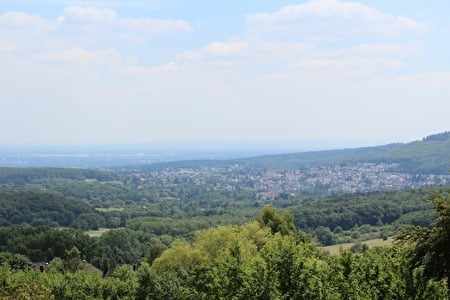 Blick vom Zauberberg in Kelkheim-Ruppertshain in Richtung Mainebene. Die sanft abfallenden Hänge des Vordertaunus bieten spektakuläre Blicke auf die Kulturlandschaft südlich des Taunushauptkamms sowie auf die Skyline der pulsierenden Finanzmetropole Frankfurt.