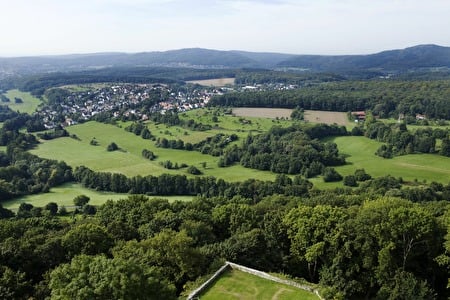 Blick vom waldreichen Taunus-Hauptkamm auf Oberreifenberg mit seiner Burgruine aus dem 14. Jahrhundert, die sich auf einer Höhe von rund 520 m über NN befindet.