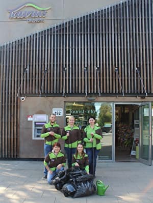 Ausgerüstet mit Greifzangen, Handschuhen, Müllsäcken und Warnwesten sammelten die sechs Mitarbeiterinnen und Mitarbeiter zunächst in der unmittelbaren Umgebung des TIZ zwischen dem rekonstruierten Keltengrab, dem Einstieg zum Keltenrundwanderweg, und der Talstation des Stoppomat Großer Feldberg. Dann wurden die Wiese vor der Terrasse des Freizeitrestaurants Waldtraut sowie der große Wanderparkplatz und Teile der angrenzenden Wanderwege von Müll befreit.