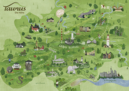 Taunus Touristik Service e.V. (TTS) zurückgreifen. Die Karte wurde in Zusammenarbeit mit einer Illustratorin liebevoll gestaltet und zeigt die schönsten
