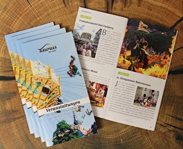 Der beliebte Taunus-Veranstaltungskalender erscheint nun seit 2011 bereits zum 17. Mal und stellt auf den ersten Seiten wie gewohnt die Veranstaltungshighlights der Freizeitregion mit stimmungsvollen Bildern und vielen Informationen vor. Dazu gehören beispielsweise das