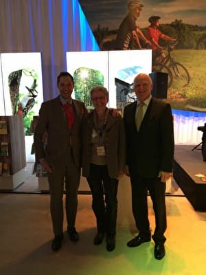 V.r.n.l: Vorsitzender des Taunus Touristik Service Roland Seel, 2. Vorsitzende des TTS Gertrud Stöckl und Mirko Reh, der bekannte Fernsehkoch, vor dem Taunus-Stand in der Halle Hessen auf der ITB in Berlin.V.l.n.r: Nadine Schnitzer (stv. TTS-Geschäftsleiterin), Martina Exner (TTS) mit dem bekannten Fernsehkoch Mirko Reh am Taunus-Stand auf der ITB in Berlin.