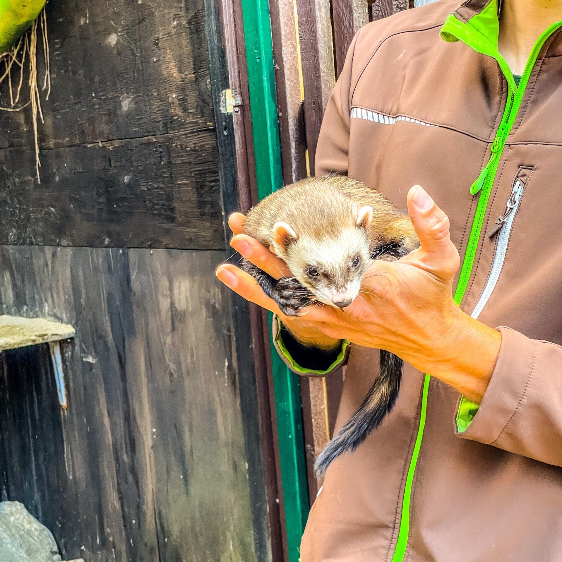 Aktuell haben 41 Vögel ihr Zuhause in der Falknerei, teilweise leben sie in Volieren, teilweise „falknerisch“ auf Stämmen im Falkenhof. Ein kleines Highlight für unsere Jungs waren die zwei süßen Frettchen, die die Vögel auf der Jagd unterstützen. Christian holte die zwei flinken Jäger sogar aus ihrem Unterschlupf raus, damit wir sie streicheln konnte, was die zwei sichtlich genossen.