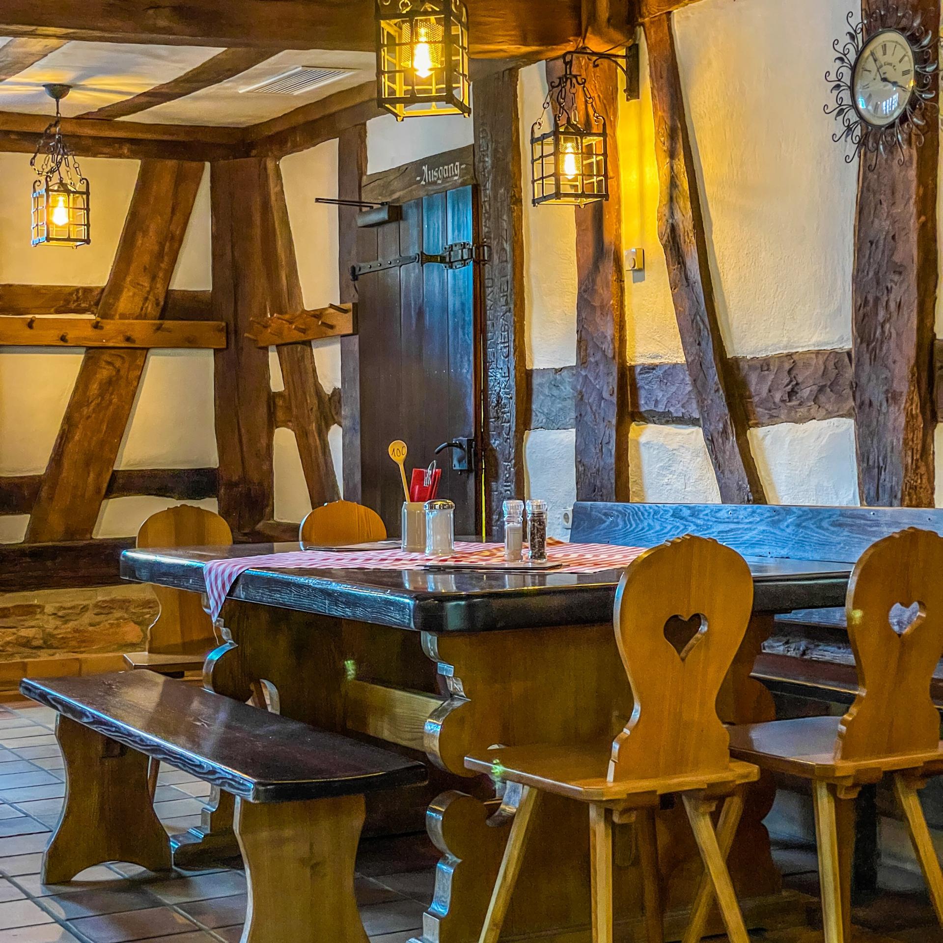 Nachdem wir nun die Siedlungen und Dörfer des Hessenparks erkundet hatten, bekamen wir so langsam Hunger. Also machten wir uns in Richtung Markplatz auf, wo wir im „Wirtshaus zum Adler“ Platz für unser Abendessen nahmen. Mit Blick auf die Fachwerk-Kulisse genossen wir das leckere hessische Essen, mit dem das Wirtshaus seine Gäste verwöhnt. Als kleiner Tipp: Es gibt sogar vegetarische und vegane Gerichte, sehr zur Freude meiner Partnerin.