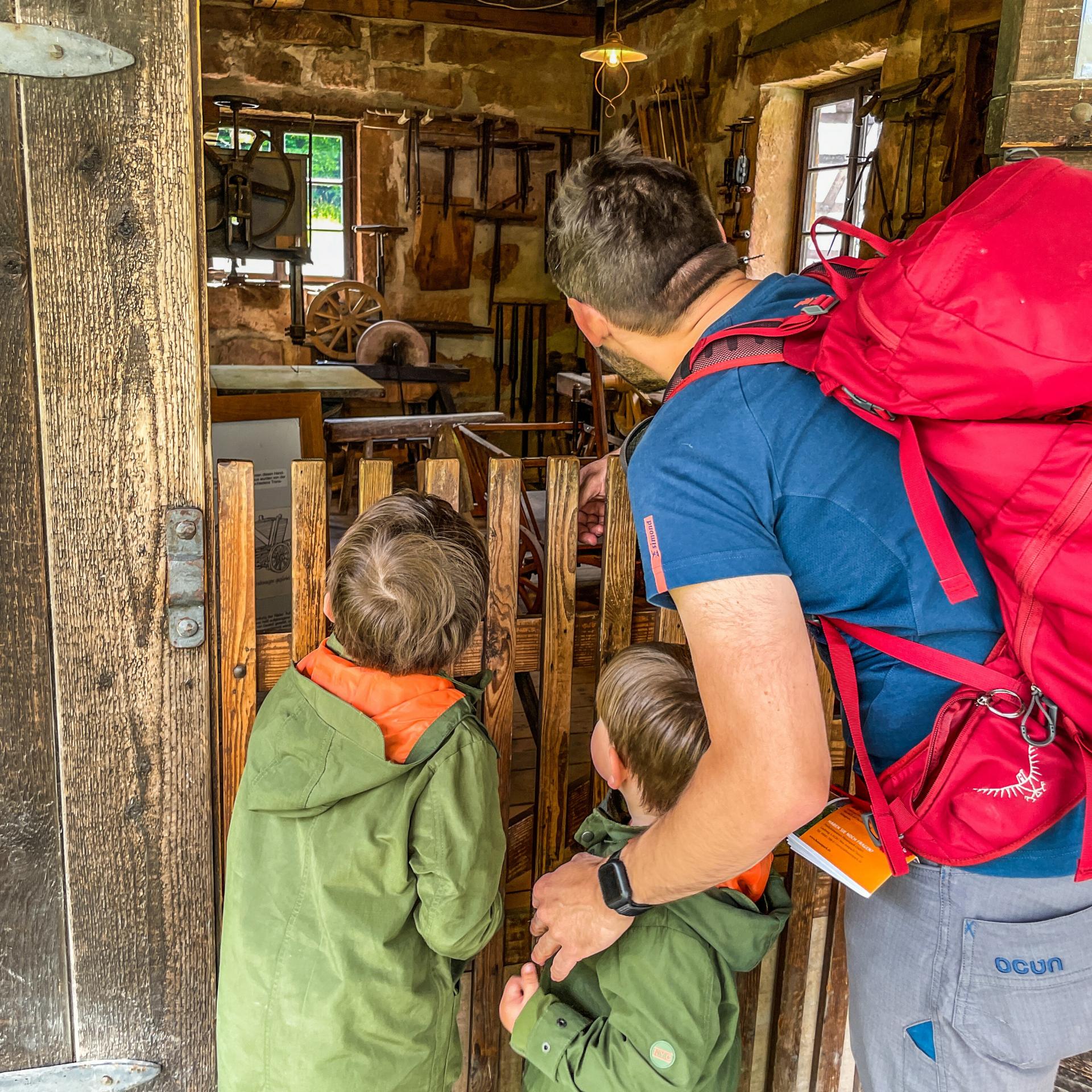 Die Jungs hatten ihren Spaß herauszufinden, in welche Häuser sie reingehen konnten und was sie in welchem Haus wohl als nächstes entdeckten. Die Ausstellungen sind, wie die Häuser selbst, alle unterschiedlich ausgebaut. Ein besonderes Highlight für die Jungs war das Haus der Familie Heck. In der Ausstellung „Bei Hecks zuhause“ können Besucher durch eine Ton- und Videoinstallation noch tiefer in die Geschichte eintauchen. Hierdurch kann man aktiv und interaktiv im Haus agieren und vieles über das Leben der Schreinerfamilie um 1840 erfahren.