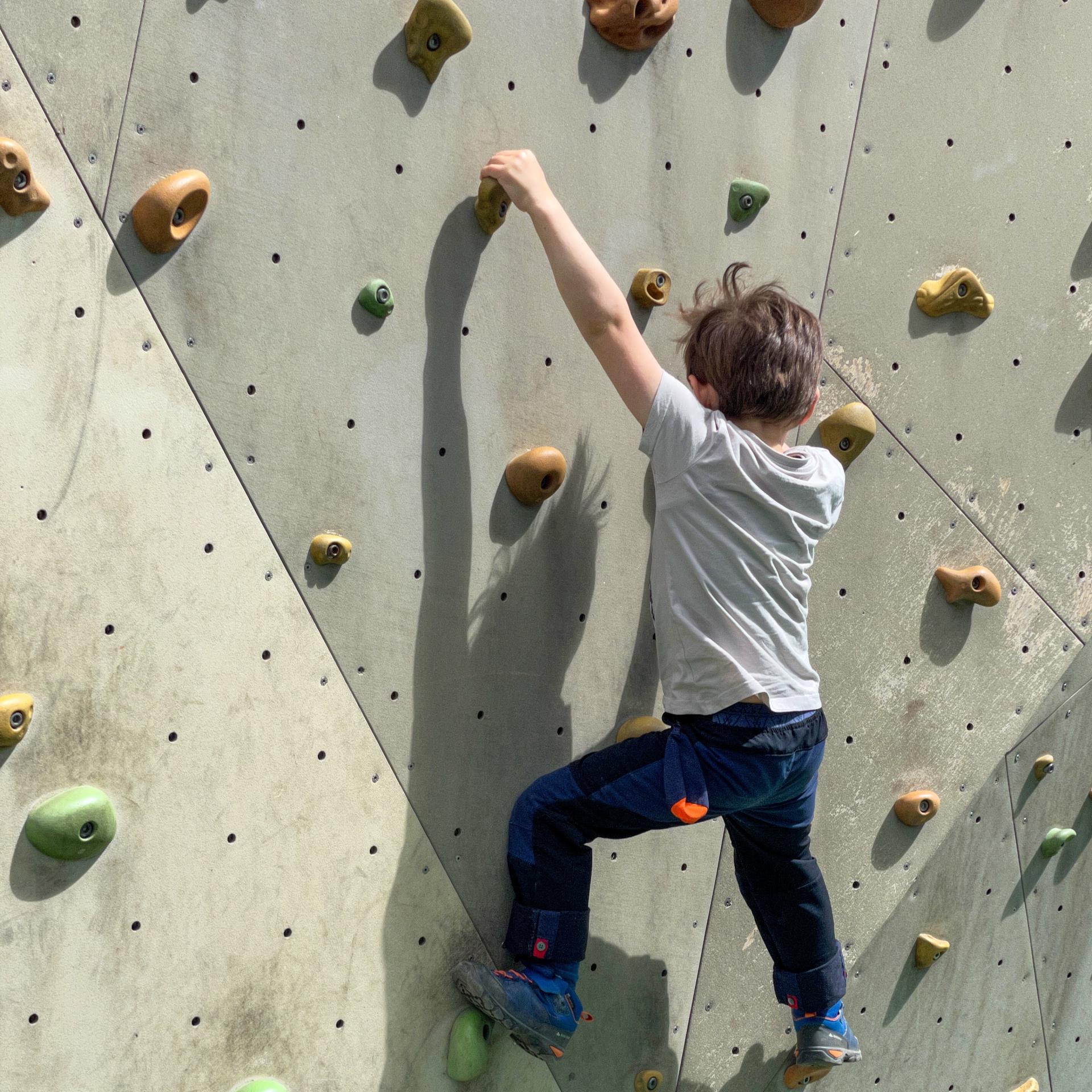Somit war auch klar, wo wir zum Mittagessen einkehren würden. Während wir auf unser Essen warteten, kletterten die Jungs an der Boulderwand und erkundeten die Wiese um die Sommerterrasse des Freizeitrestaurants Waldtraut.
