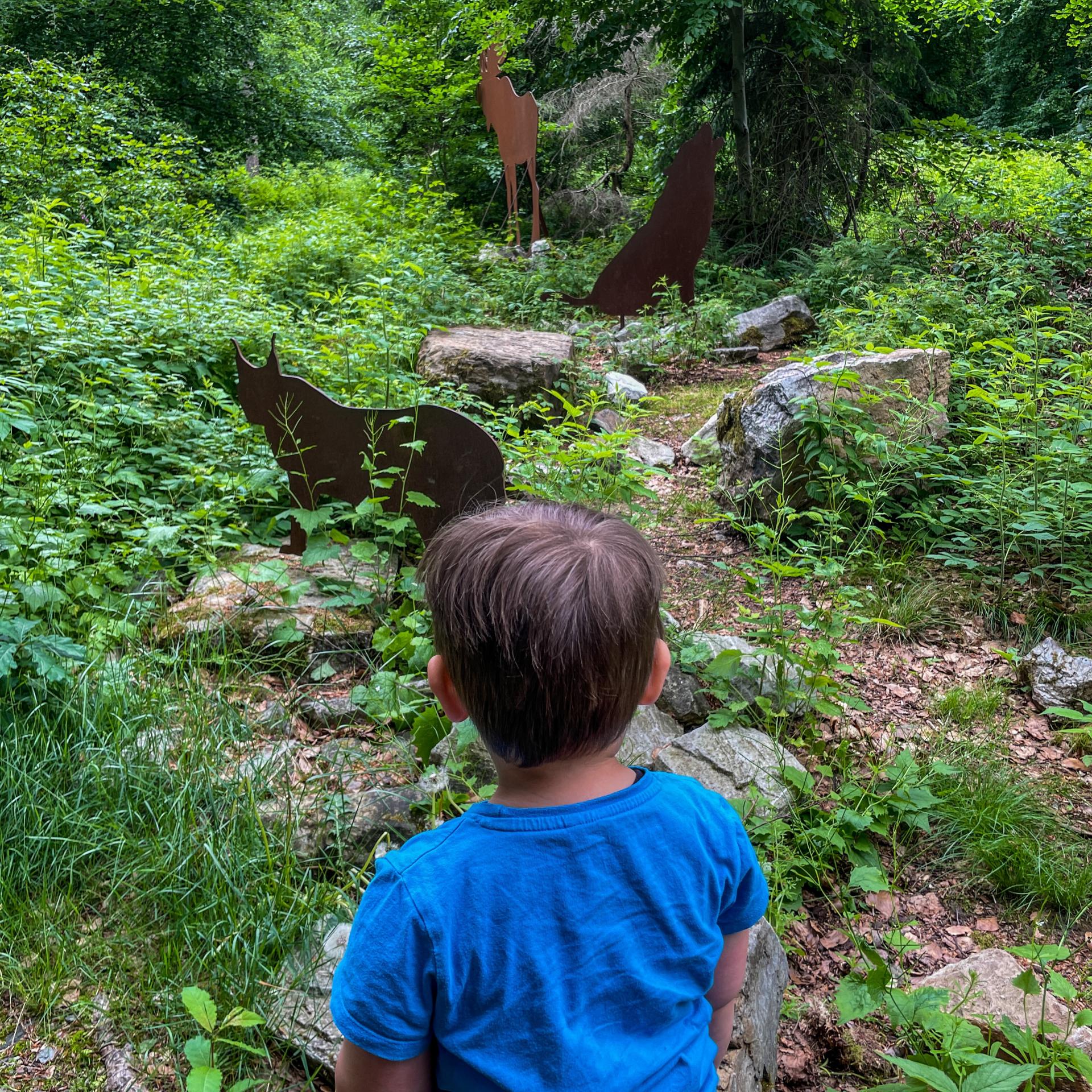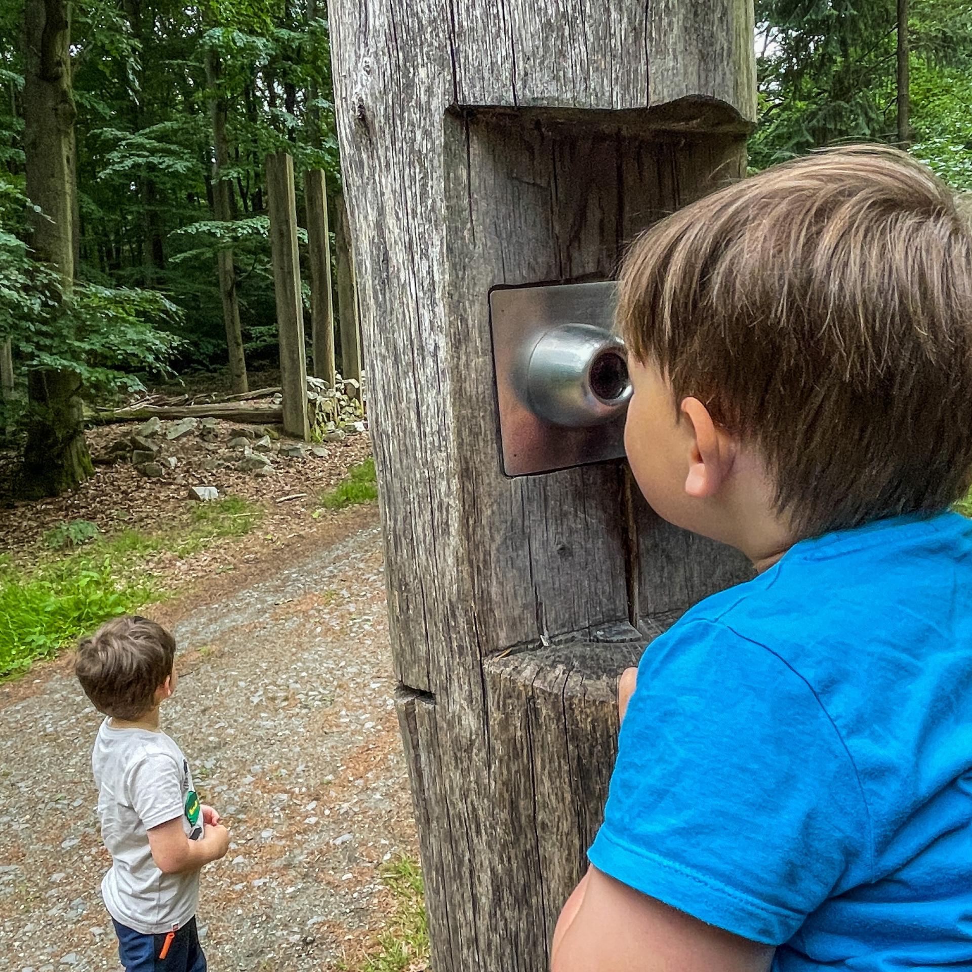 Der Weg ist gesäumt von speziellen Fernglas-Säulen, die es den Jungs besonders angetan hatten. Das sind Säulen, an denen ein Fernglas montiert ist, durch das man in die Zeit der Kelten schauen kann.