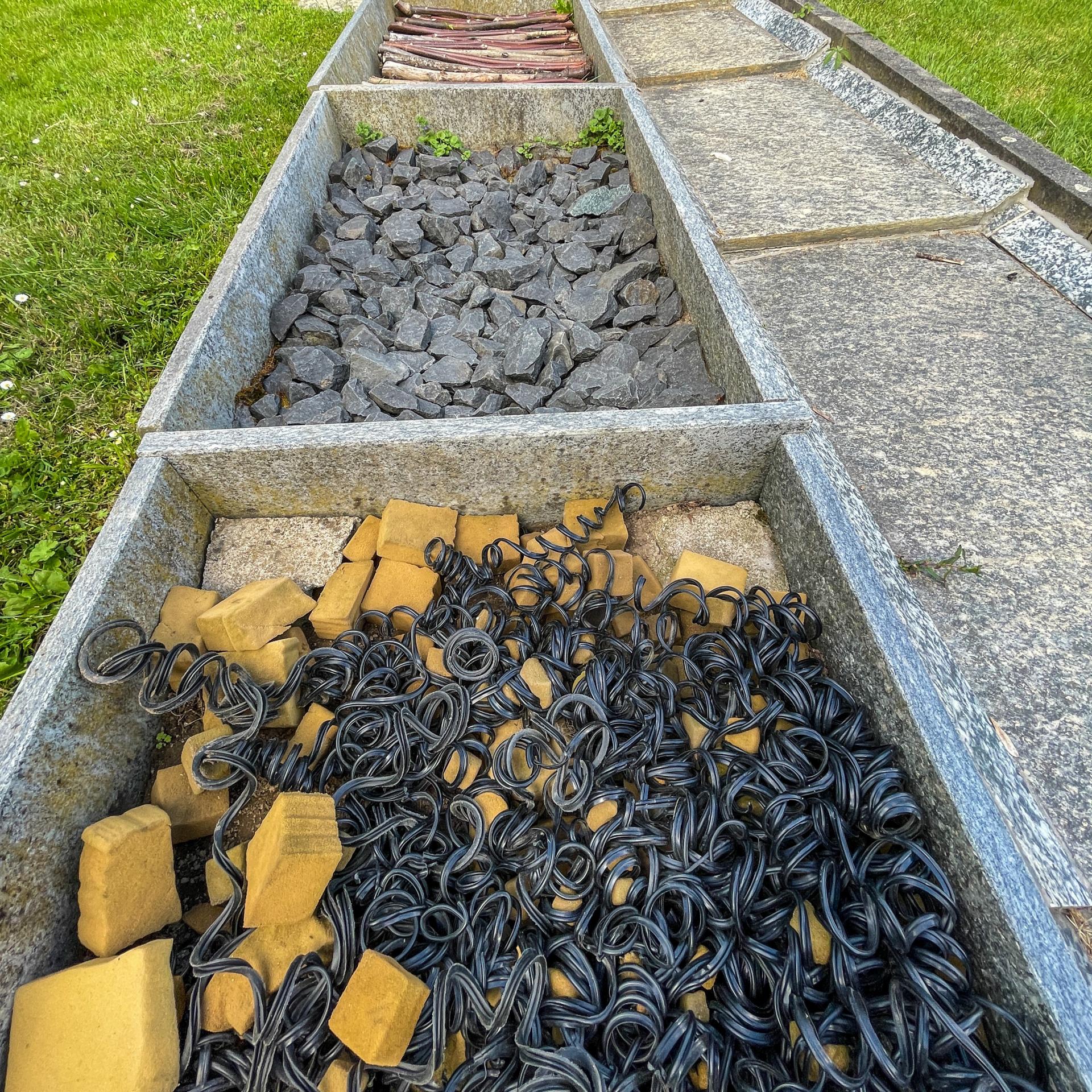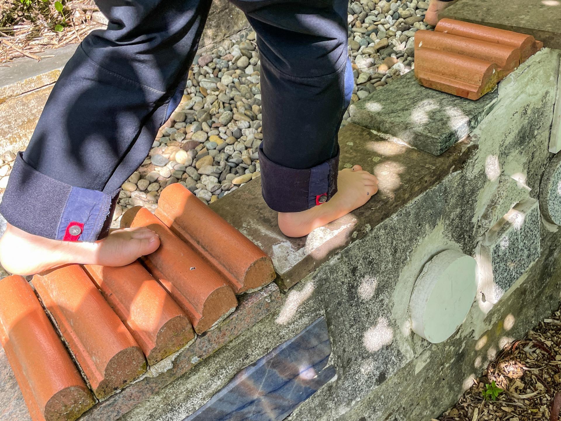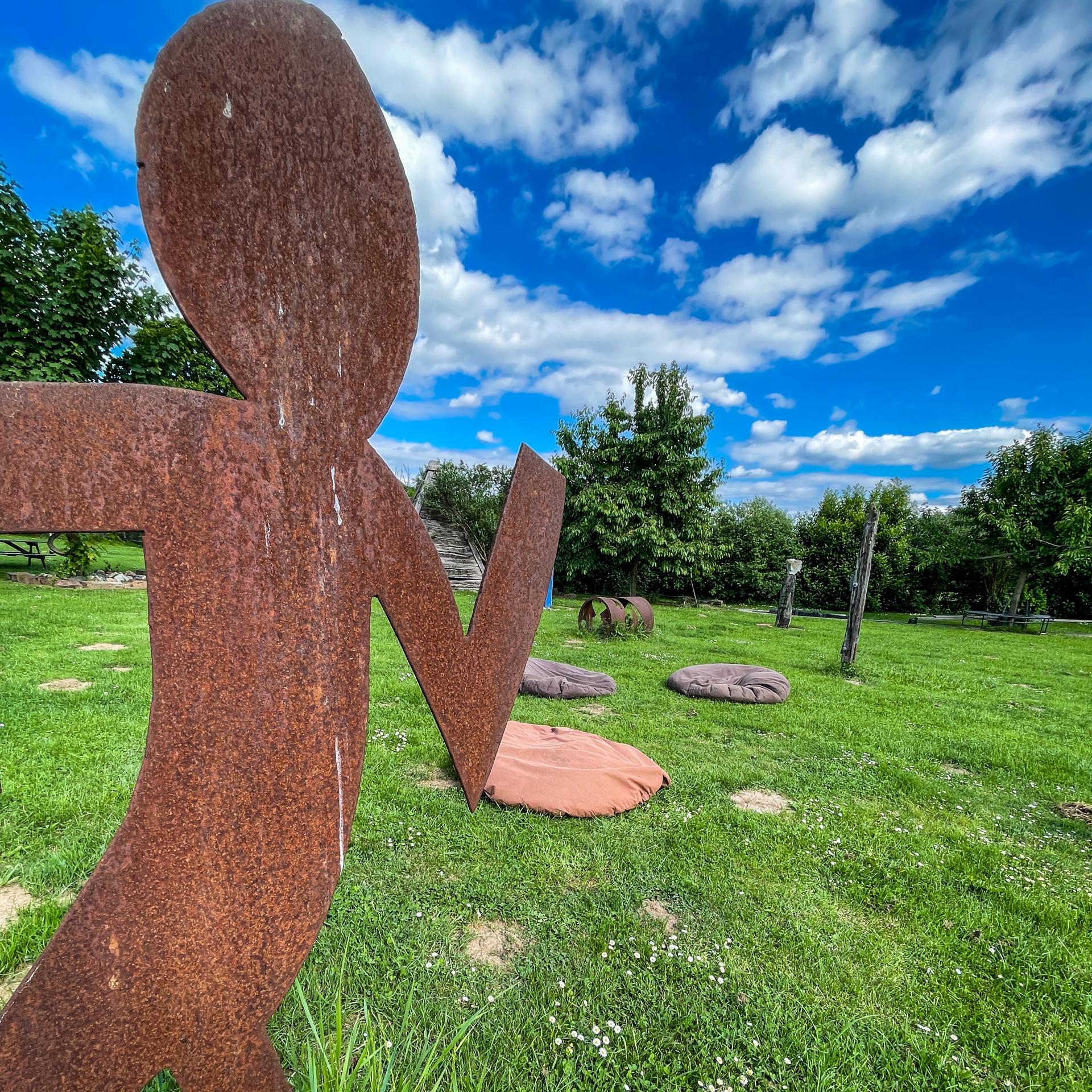 Nachdem wir unsere Schuhe auszogen und eine kurze Unterweisung erhielten, ging es auch schon direkt los. Der Pfad mit mehr als 120 Fühl- und Balancier-Stationen, der nicht nur unsere Fußsohlen, sondern all unsere Sinne anregte, führte uns durch den wunderschönen parkähnlichen Garten. Es lohnt sich also, Augen und Ohren offen zu halten, denn entlang des Pfads sind viele Highlights versteckt, die man nicht auf den ersten Blick entdecken kann. Deswegen sind wir die Sinnesstrecke mehrfach abgelaufen und haben dabei immer neue Routen entdeckt. Es ging vorbei an Skulpturen, Kräutern, Streuobstwiesen und Weidelauben.