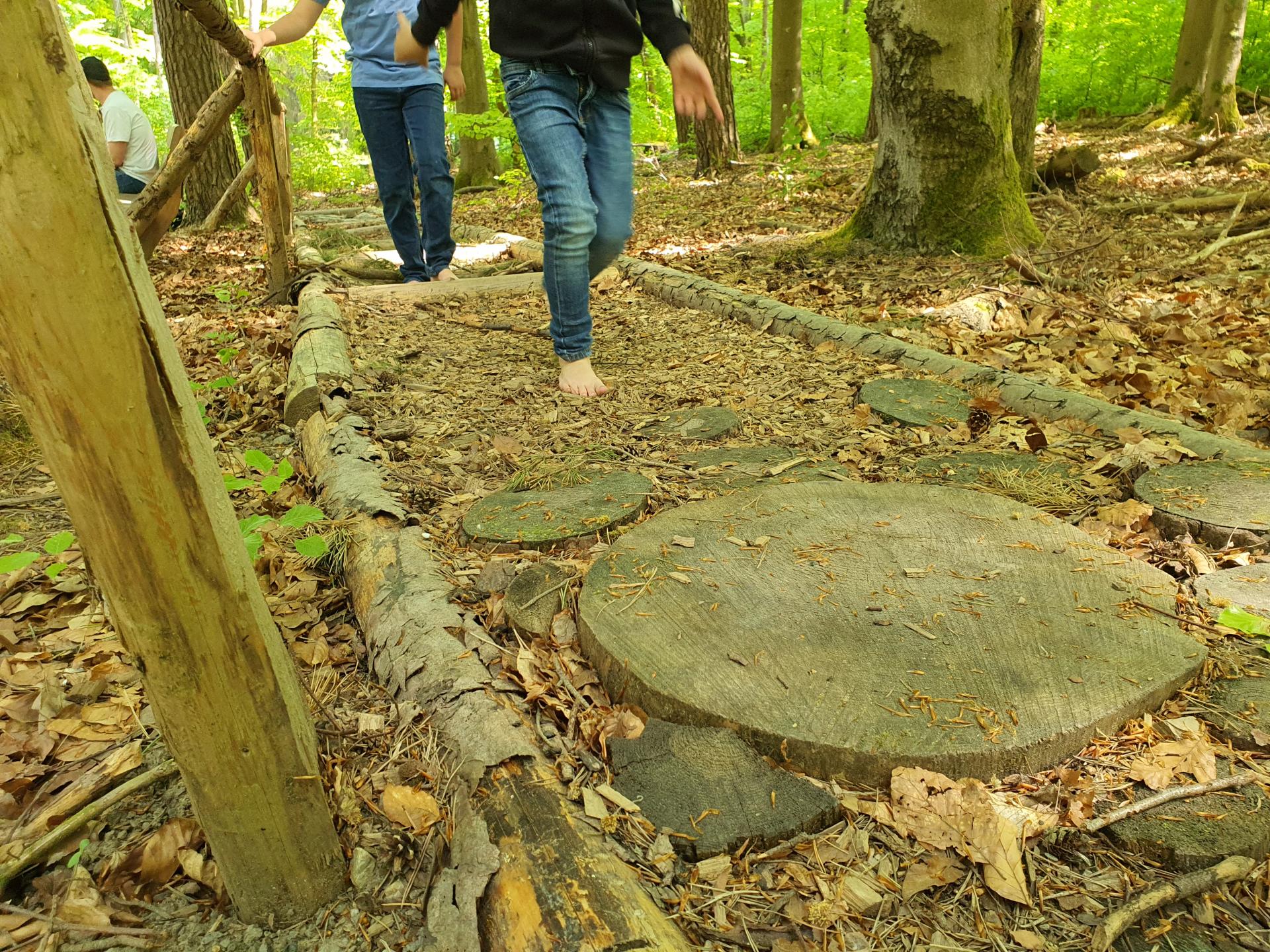 Kaum am Barfußpfad angekommen, werden die Schuhe und Socken schon von den Füßen gezerrt. Einhelliges Urteil: Kleine Steine sind ganz schön gemein, die Baumscheiben fühlen sich okay an und am Schönsten ist es, Sand unter den Füßen zu haben. Zwischen den Bäumen bietet das Lichtspiel eine entspannte Atmosphäre und die Kinder staunen über die Holzkunstwerke, die den Weg säumen.