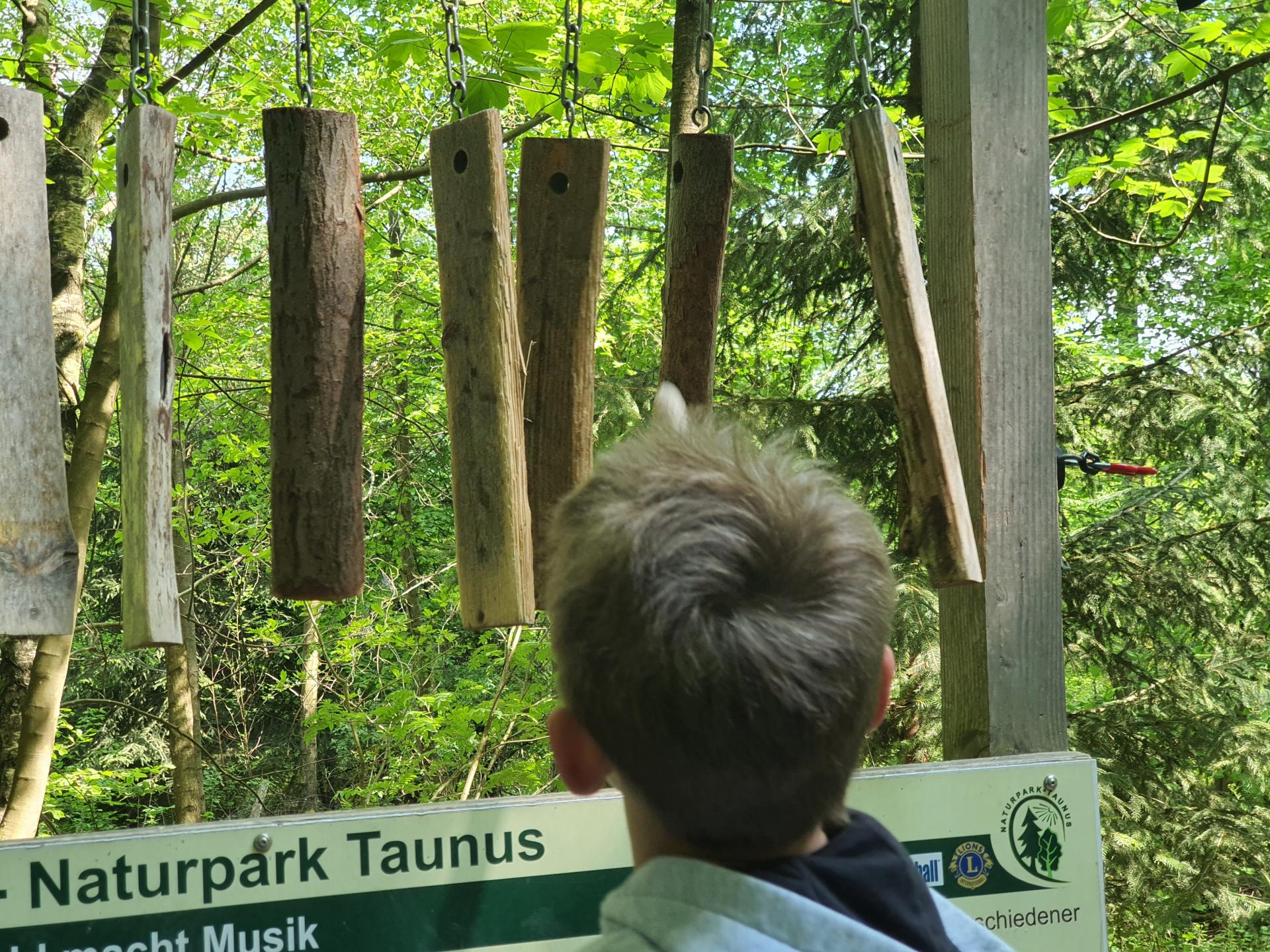 So wird das Baumtelefon bestaunt und beim Tierweitsprung versuchen sich die Kinder immer wieder gegenseitig zu überbieten. Hier geht es dicht auf dicht mit den Eindrücken: Das Waldxylophon begeistert die Jungs besonders. Wie unterschiedlich Holz doch klingen kann… Um die Ecke gebogen geht es auch schon wieder aus dem Wald heraus und entlang des Waldrands finden wir eine Beine-Baumel-Bank. Wir machen eine Pause und lassen uns von den Frühlingsstrahlen das Gesicht wärmen.