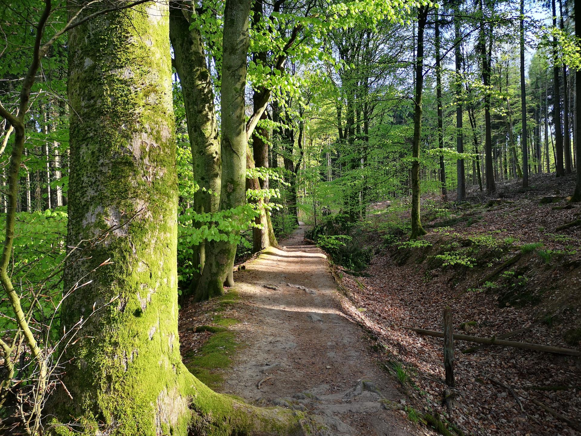 Wir überqueren die Kanonenstraße über die Brücke und wandern zu Beginn bergauf parallel zum Keltenwanderweg, hinauf zum höchsten Punkt der Tour (357 m). Auf der Gaulshohl führt der Weg zur ersten von sieben Pulttafeln, wo wir etwas zum Thema Fahrspuren und Hohlwege erfahren.