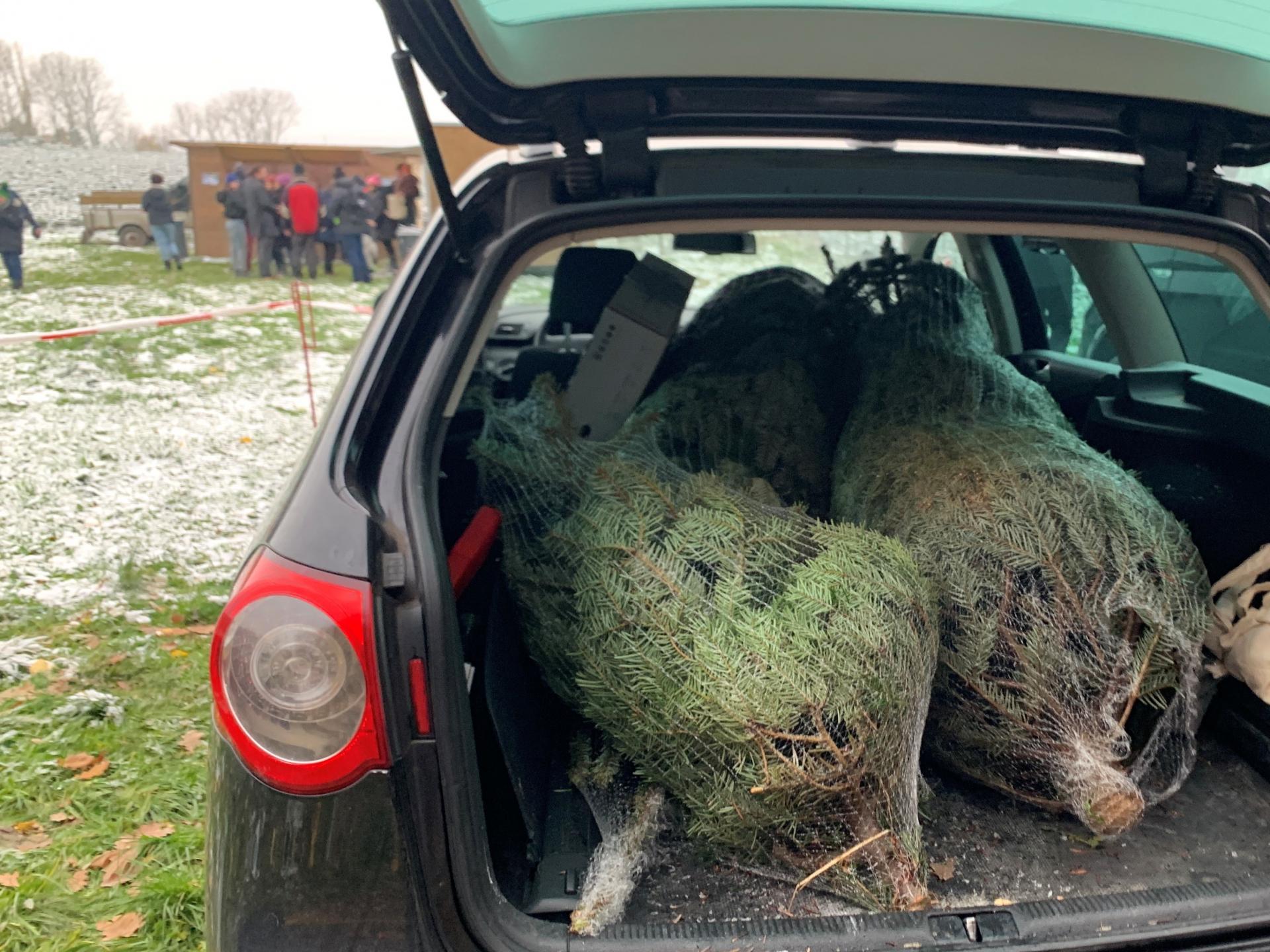 Wir lassen uns noch Tipps geben, wie wir die Bäume am besten lagern, bis sie in unseren Wohnzimmern landen: Am besten stehend, in einem Eimer Wasser im Netz. Ein bis zwei Tage bevor der Baum aufgestellt werden soll aus dem Netz nehmen, damit die Äste sich wieder entspannen können. Glücklicherweise sind es nur wenige Meter bis zu unseren Autos, sodass wir die Bäume nicht allzu weit tragen müssen. Und jetzt zeigt sich, es war eine gute Idee, zwei Autos zu nehmen. Eins ist jetzt nämlich voll mit Weihnachtsbäumen und riecht ganz wunderbar weihnachtlich.